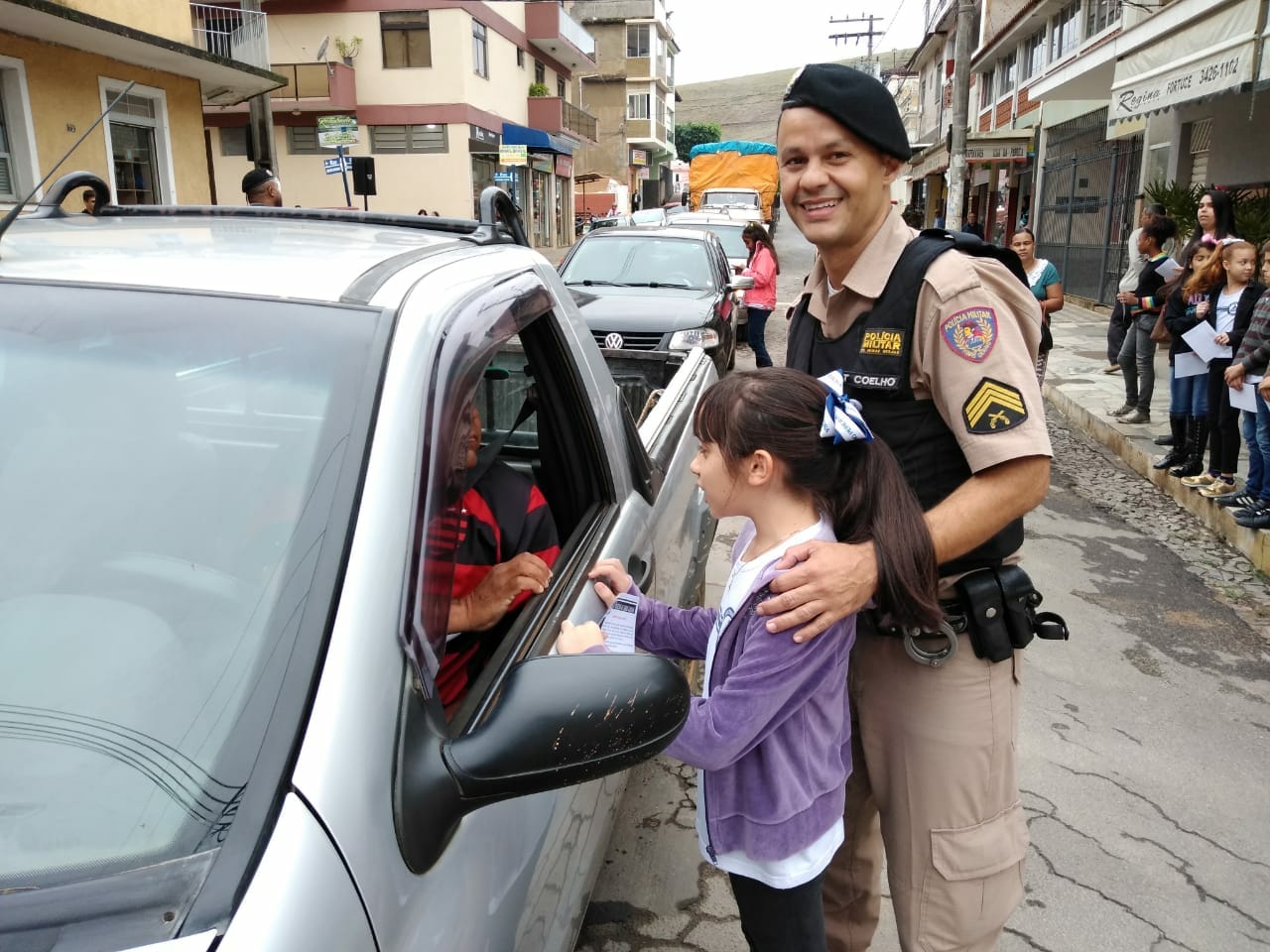 Assimiladas às orientações, as crianças foram pra rua e realizaram junto com a PM uma blitz educativa, distribuindo Dicas da PM, orientando condutores e usuários da via pública acerca da importância da prevenção ao uso de drogas e abuso no trânsito.